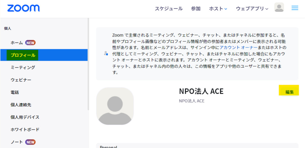 - 「プロフィール」内で名前の右にある「編集」を選ぶ