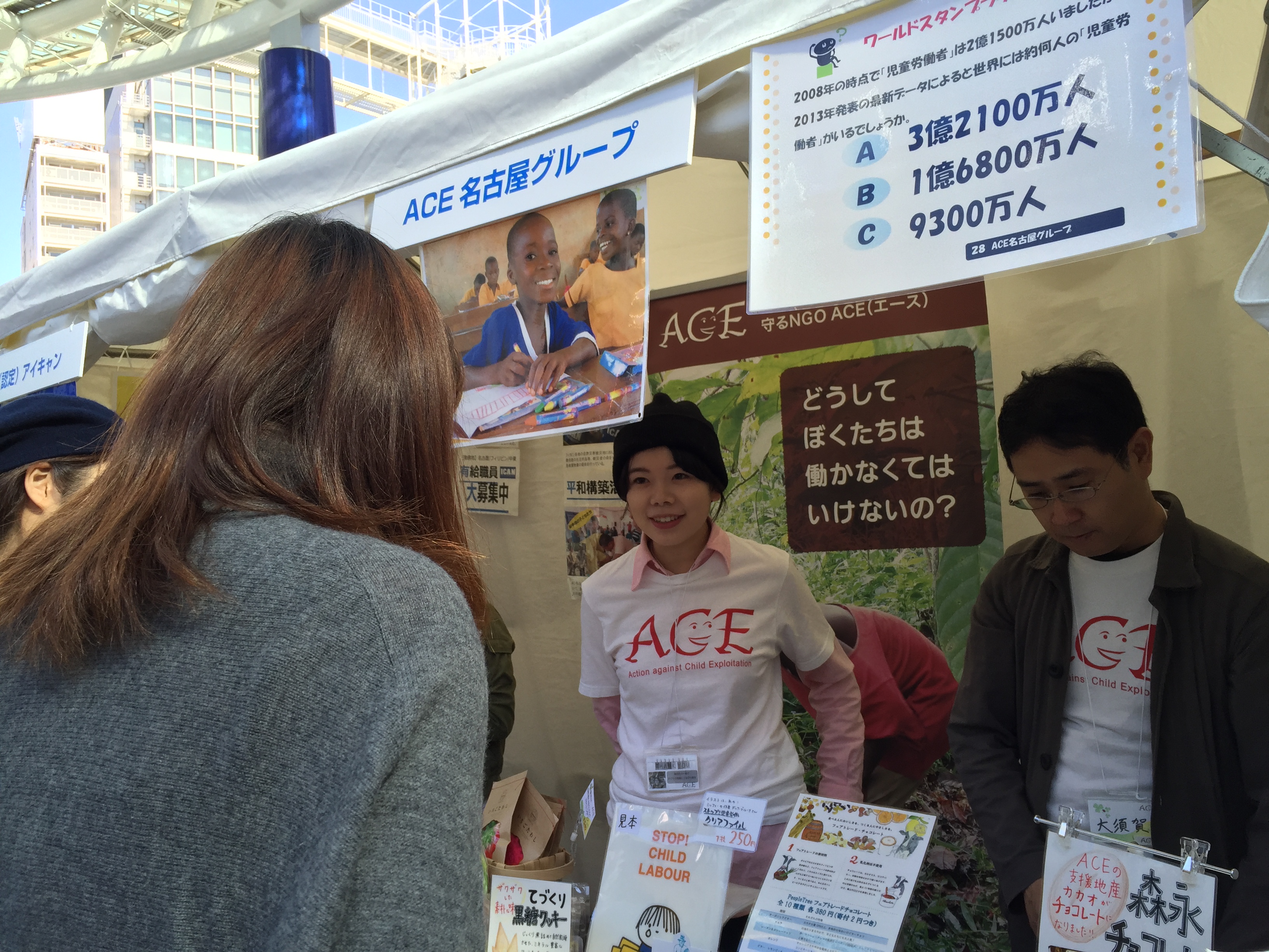 | お願いしたいこと | 以下の活動をACEスタッフや名古屋グループのコアメンバーと一緒に行って頂きます。 ・「しあわせを運ぶ てんとう虫チョコ」などフェアトレード商品の販売 ・活動紹介、クイズやスタンプラリーの対応 ・ブースへの呼び込み、パンフレットの配布 |