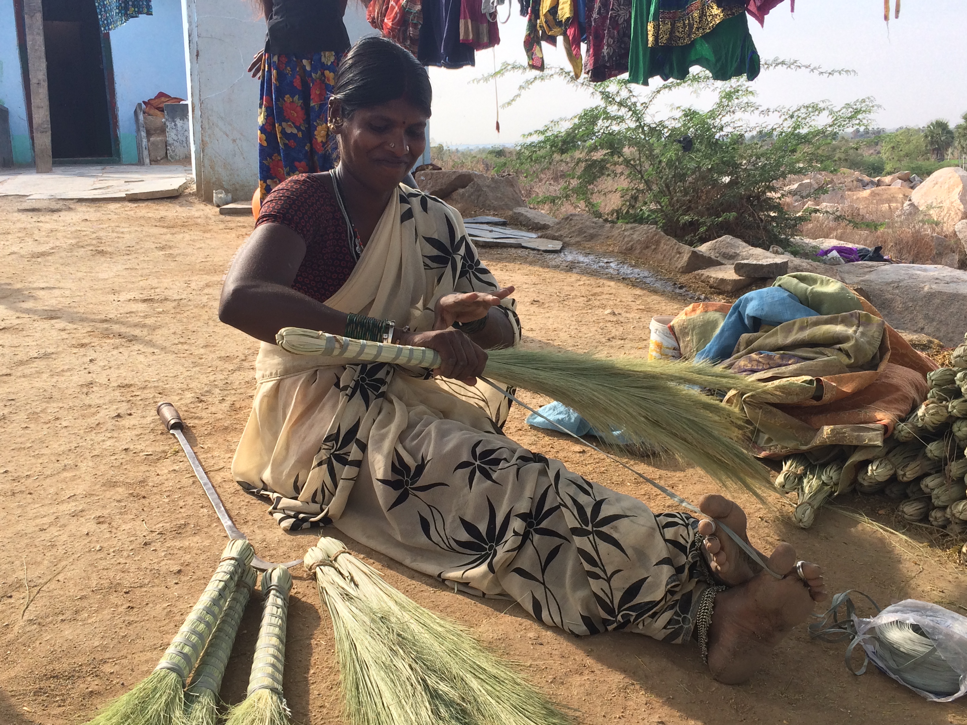 そのうちの1人が、シャンカランマさんです。シャンカランマさんのお母さんは元々ほうきを作ることを職業としていたため、ほうきの作り方をシャンカランマさんは知っていましたが、この地域ではほうきを作るのに適した葉を手に入れることができず、その仕事をやめ、日雇いで農業の仕事をしていました。 夫婦ともに働いていましたが家計を支えることができず、4人の子どもは学校に行くことができていませんでした。そこで、支援を行うことが決まった際に本人に確認したところ、「もっと質の良いほうきを作りたい」と訴えてきたため、ほうきの材料となる粗い葉を細くなめらかに削るためのモーターを少額融資として支援しました。シャンカランマさんはほうきの作り方は知っていましたが、どのように金額を決めたり、売ればよいのか知らなかったため、訓練を受けてもらいました。