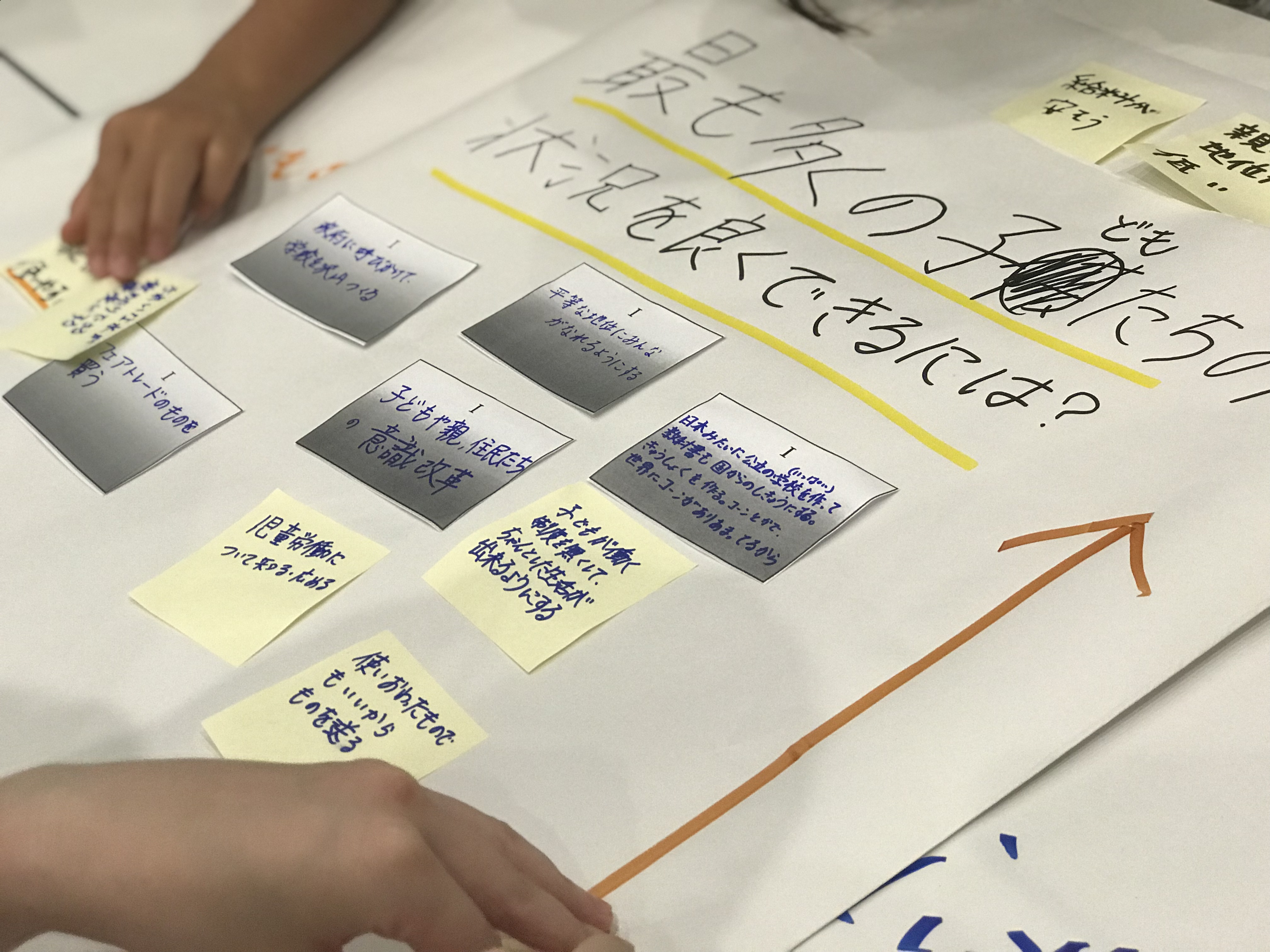 その後、上記の課題を解決するために「最も子どもたちの状況を良くするためには?」というテーマで、各グループでアクションシートを作り上げ、発表の場面では、以下のような意見が出ました。