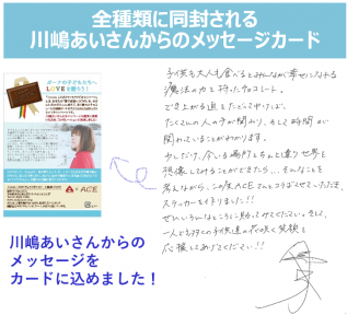 川嶋あいさんにもデザインのアイディアをいただきながら一緒に作り上げた「1 more LOVEチョコステッカー Ai Kawashima × ACE」は、川嶋あいさんのロゴや手書きイラスト、直筆サインなどがちりばめられており、ポップで可愛らしいステッカーを全部で3種類ご用意しました。全種類に同封されるカードには、川嶋あいさんからのメッセージも書かれています。