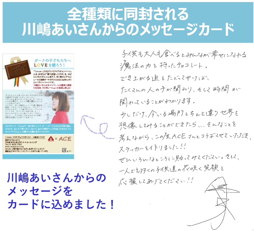 今回のコラボ企画では、2018年8月20日に行われる川嶋あいさんのワンマンライブ『Ai Kawashima 15th anniversary~BIRTH~』のライブ会場にて、「1 more LOVEチョコステッカー Ai Kawashima × ACE」(1枚500円・数量限定)の販売を行います。このステッカーの売上の一部は、ACEがガーナのカカオ産地で実施する、子どもたちを児童労働から救い教育を支援するプロジェクトの活動資金として、大切に使わせていただきます。