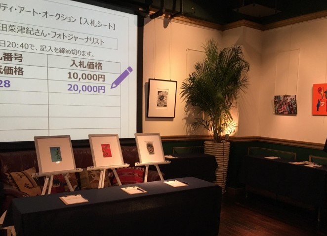 昨年は、インターネット上のオークションでしたが、今年は実際に作品を間近でご覧いただきながらオークションにご参加いただきたいという想いから、東京・渋谷のワインバー ローディにて作品を展示させていただき、サイレントオークションという形でオークションを実施しました。
