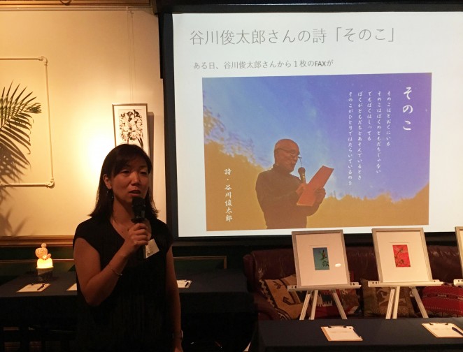 イベントの冒頭で、まずはACE代表の岩附よりご挨拶させていただき、谷川俊太郎さんの詩「そのこ」を朗読させていただきました。「そのこ」は、日本を代表する詩人でACEのマンスリーサポーターでもある谷川俊太郎さんが書いてくださった詩です。私たちACEが「アートの力」で児童労働問題をたくさんの人々に伝えたいと思ったきっかけになった詩でもあります。