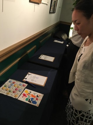 今回のオークションは、サイレントオークションという形を取らせていただきました。それぞれの作品の前に記入用紙が設置されており、その用紙に入札額を記入していただく形です。