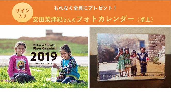 キャンペーン期間中(2018年10月20日~2018年11月20日)に「子どもの権利サポーター」にご入会いただいた方全員に、各種メディアでご活躍中のフォトジャーナリスト安田菜津紀さんの「オフィシャルフォトカレンダー2019年(卓上)」をプレゼントいたします!ACEが支援している村の子ども達の写真もたくさん掲載されています。ぜひご自宅・職場等でお使いください。