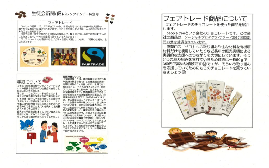 さっそくこの学びを行動に繋げよう、と私も所属している生徒会執行部が全校に向けて発信している新聞で児童労働の現状をはじめとし、フェアトレードや売上の一部を寄付するチョコレートの商品を紹介し、実際に生徒会でその企業に手紙を送った取り組みも報告して、児童労働について考え、自分にできることを行動に移すことを呼びかけました。これからもこの学習やACEの方々の取り組みを参考に、私たちにできることを見つけ、行動に移していきたいと思います。
