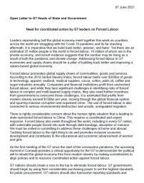 G7サミット(主要7カ国首脳会議)に先立って、ACEは世界のNGOなどとともに、G7首脳に対してオープン・レター(公開状)「G7首脳による強制労働に対する協調行動の必要性」を出しました。2021年6月13日に発表されたG7首脳宣言には、グローバル・サプライチェーンにおける強制労働根絶へのコミットメントが示されました。