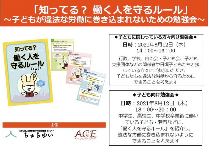 ACEによる沖縄でのイベント第3弾、『「知ってる?働く人を守るルール」~子どもが違法な労働に巻き込まれないための勉強会~』をNPO法人沖縄青少年自立援助センター ちゅらゆいさんとの共催で、2021年8月12日に開催しました。ちゅらゆいさんは、那覇市とうるま市で不登校、引きこもり、障害をもつ子どもたちなどの居場所の運営を行うなど、社会的自立を支援する活動をされています。