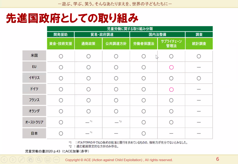 次に、ACEの共同創業者であり、現在副代表を務める白木朋子より、ガーナ政府と2018年より進めている、児童労働の予防と解決に必要な仕組みや制度が整備された地域(自治体)づくりをめざす、児童労働フリーゾーン(CLFZ)制度について説明しました。また、ソーシャルビジネス推進事業チーフの及川有希子より、2020年にJICAによって発足した「開発途上国におけるサステイナブル・カカオ・プラットフォーム」を通じた、さまざまなアクターによるコレクティブ・インパクトをめざす取り組み、そして、児童労働のないカカオのサプライチェーン実現に向け、2021年12月にJICAとACEが共同で立ち上げた児童労働分科会のご紹介をしました。