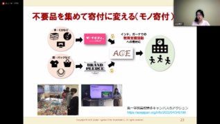 中高生によるアクション事例に関しては、上記の写真にある「モノ寄付」や出前授業を含め、学校内でできるもの、学校外でできる10のアクションについて、どのように行い、どのようにSDGsに貢献できるかなど詳しく説明しました。