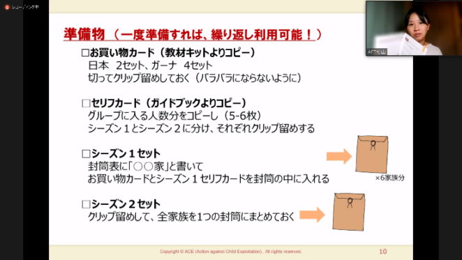 セミナーでは、①児童労働とは何か、児童労働とSDGsはどのようにつながっているのか、②ACEに寄せられた中学生・高校生が実際に行ったアクション、③ワークショップ教材「おいしいチョコレートの真実」の紹介を行いました。