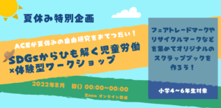 自分たちの普段の生活とSDGsがどのように関わっているかを知り、私たちに何ができるのかを夏休みの子どもたちと一緒に考えるイベントとして「【夏休み特別企画】ACEが夏休みの自由研究をおてつだい!SDGsからひも解く児童労働×体験型ワークショップ 」を、2022年8月17日(水)にオンラインで開催しました。イベントには小学生を中心に、大学生も含む19名が参加してくれました。