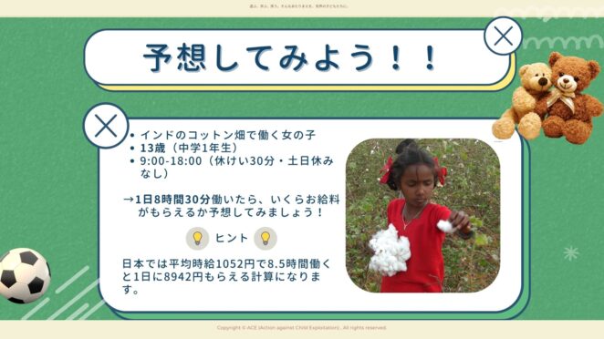 ワークショップでは、まず最初にSDGsとは何か、児童労働とは何かという説明を行いました。説明の後に設けた「復習タイム」では、用意された問題に対して正解の選択肢に多くの参加者の手が上がり、関心を持って聞いてくれたことを感じました。