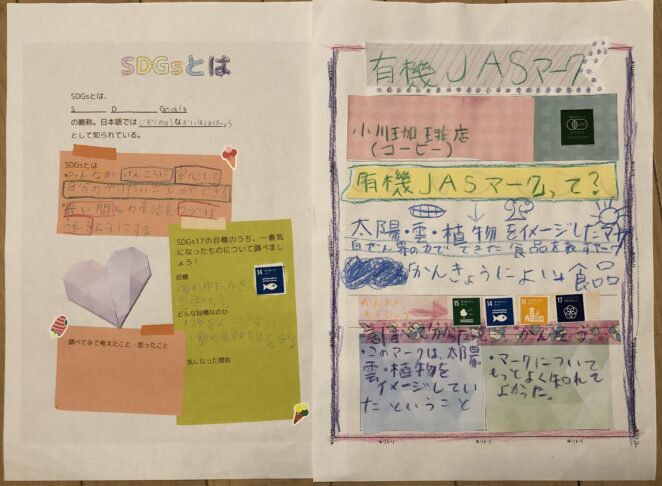 最後に、それまでに学んだことを通して、SDGsに関連するマークを使ったスクラップブックの作成を行いました。