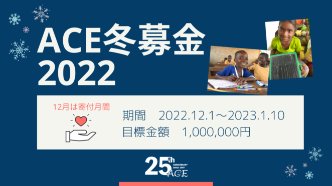 2022年12月から2023年1月10日までの期間、「ACE冬募金2022」として、100万円を目標にご寄付を募っています。