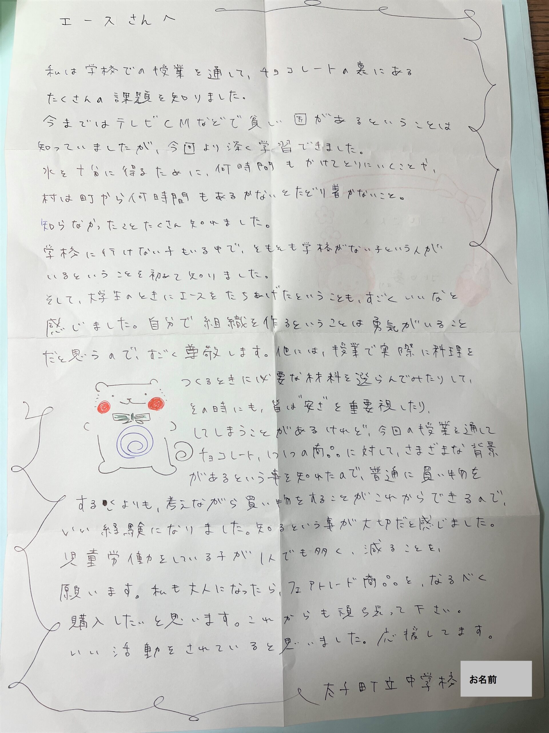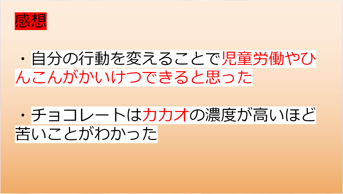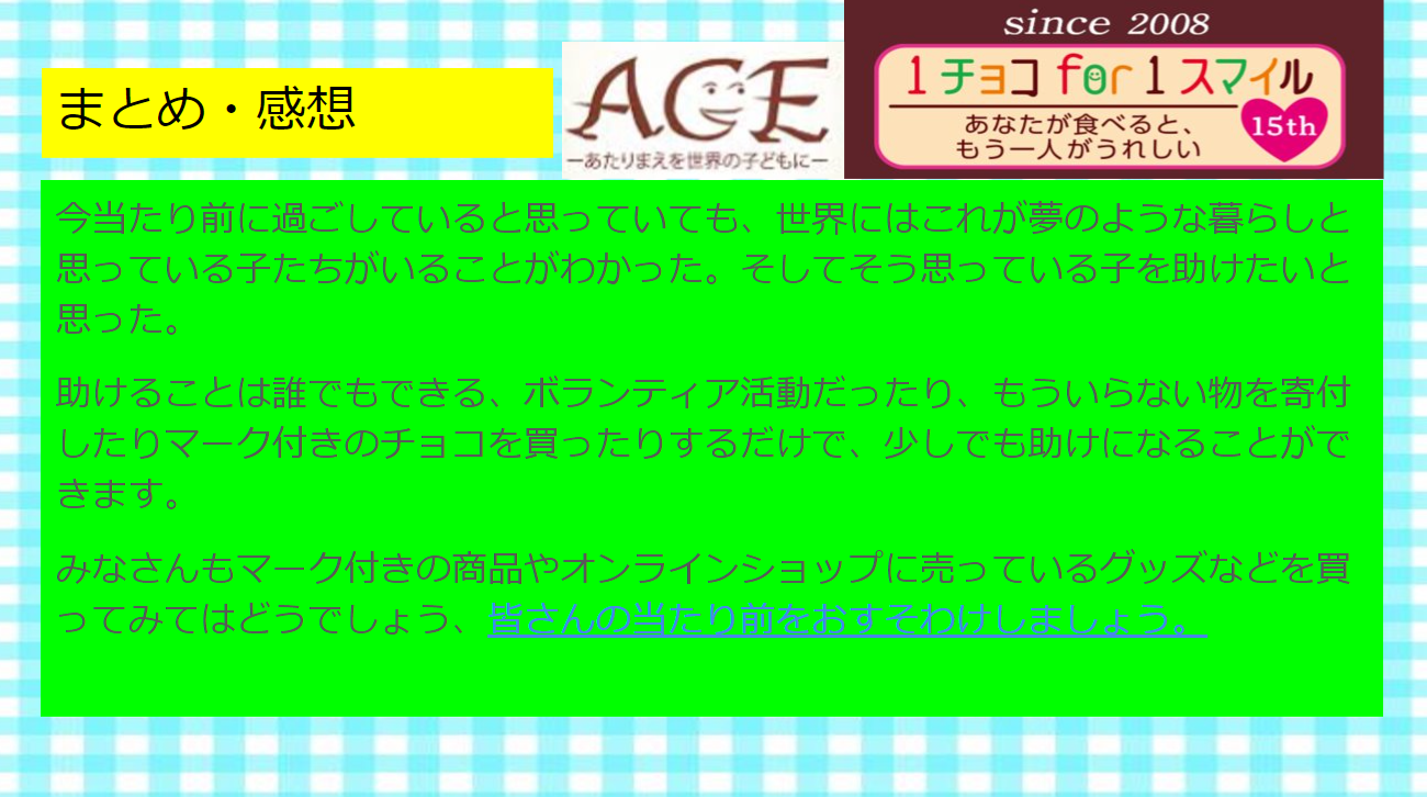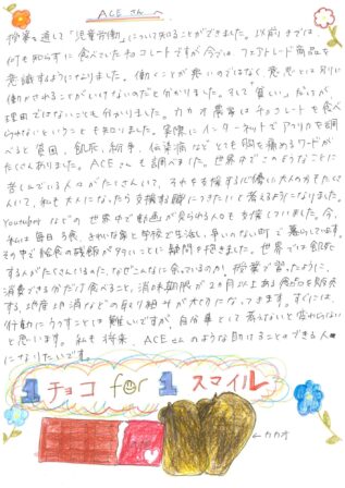 大阪府太子町立中学校の先生から、チョコレートの課題から児童労働やACEの活動を学ぶ授業の実施報告と、その授業を受けた児童・生徒のみなさんからの発表報告やお手紙が届きましたのでご紹介します。