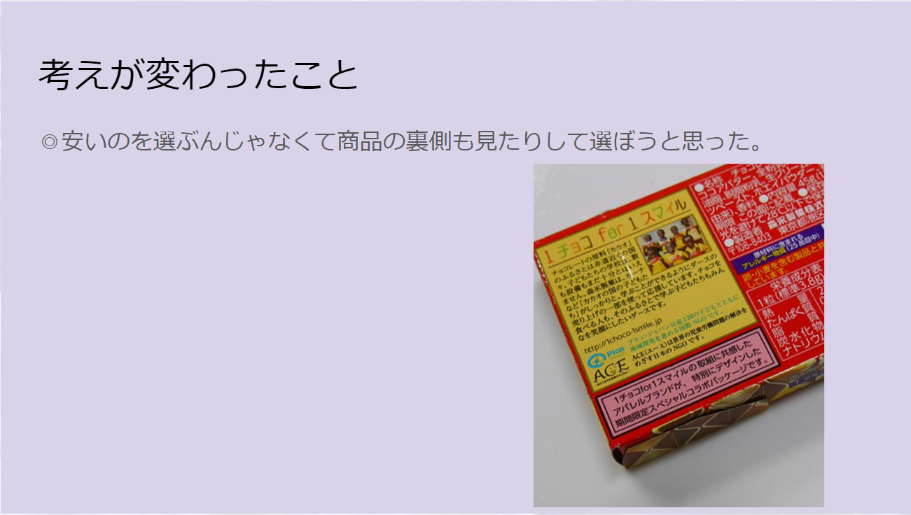 個人発表以外にも、班行動でフェアトレードについてのポスター作成をしたり、エシカル消費の買い物ゲームを行うなど、さらに自分事になるように振り返りをして学びを深めたそうです。