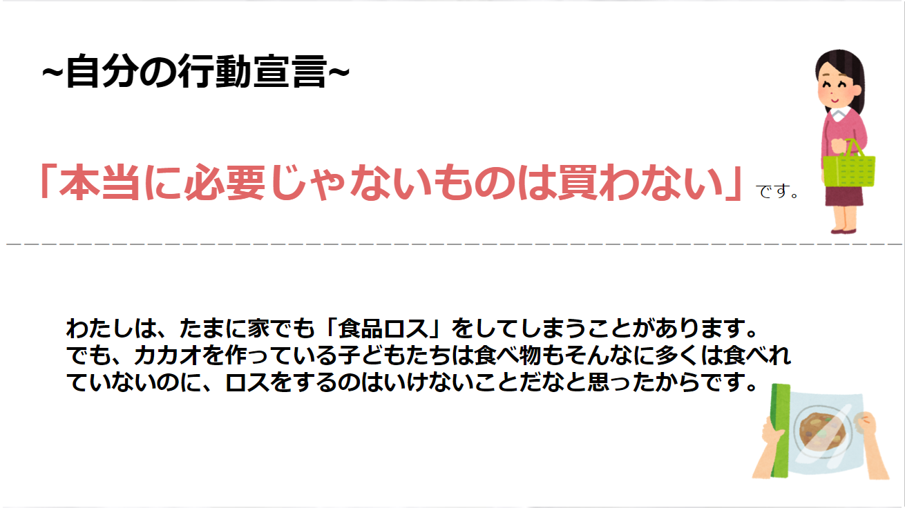 6年生のみなさんが学んだことをまとめ個人発表したスライドも共有いただいたので、一部ご紹介します(共有いただいた5名の発表からスライドを1枚ずつ抜粋しています)。それぞれが考え自分なりの行動宣言や発信を行ったのがとてもよく伝わります。