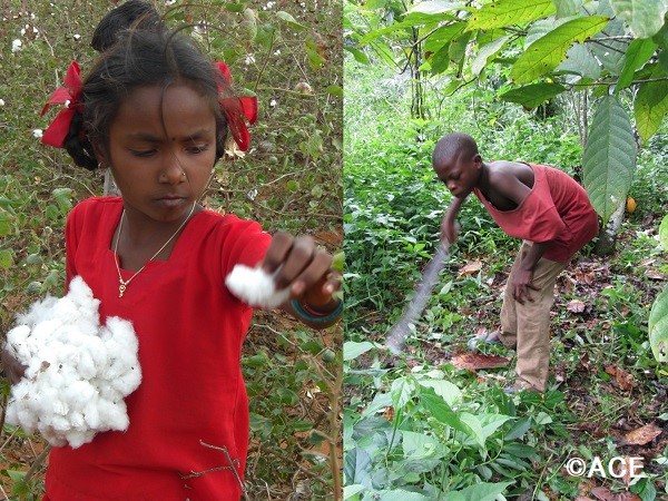 写真左:コットン生産地で働く子ども、写真右:カカオ生産地で働く子ども