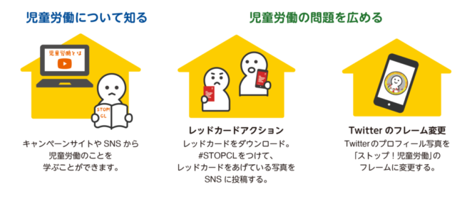 キャンペーンのウェブサイトでは、「児童労働について知る」コンテンツのほか、「児童労働にレッドカード!」の意味を込めたレッドカードの写真をSNSに投稿する「レッドカードアクション」、Twitterのプロフィール写真用の「ストップ!児童労働」のフレームなどを紹介しており、「おうちでできるアクション」への参加を呼びかけています。