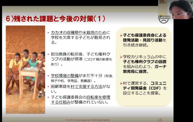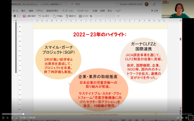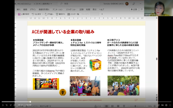 前半では、白木朋子(ACE 副代表、共同創設者)と佐藤有希子(ACE ソーシャルビジネス推進事業 チーフ)より、ACEが2009年から実施している「しあわせへのチョコレート」プロジェクトの概要とガーナでの支援活動および消費者の啓発、企業との連携、政策提言などの事業横断的な取り組みにおける、最近1年間の活動ハイライトを報告しました。特にこの1年は、日本のチョコレート企業による児童労働撤廃へ向けた取り組みが前進し、メディアで取り上げられる機会が増えたこと、そしてACEも参加している「開発途上国におけるサステイナブル・カカオ・プラットフォーム」(事務局:JICA)では、「児童労働撤廃に向けたセクター別アクション」を策定し発表したことなどを報告しました。また、ガーナ政府が進めている「児童労働フリーゾーン(CLFZ)」制度の構築については、2020年11月から2022年6月までに実施したJICA調査事業からの学びについても簡単に報告しました。