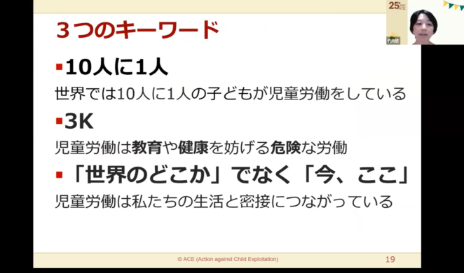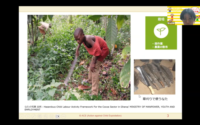 始めに、世界と日本の児童労働の現状についてお伝えしました。世界の子どもの10人に1人が児童労働をしていること、アフリカでの状況が深刻なこと、私たちの身近な商品の裏側にも児童労働が存在している可能性があること、「日本の児童労働」の具体例、そしてこういった課題に対してACEが行っている活動などについて、簡単にご説明しました。