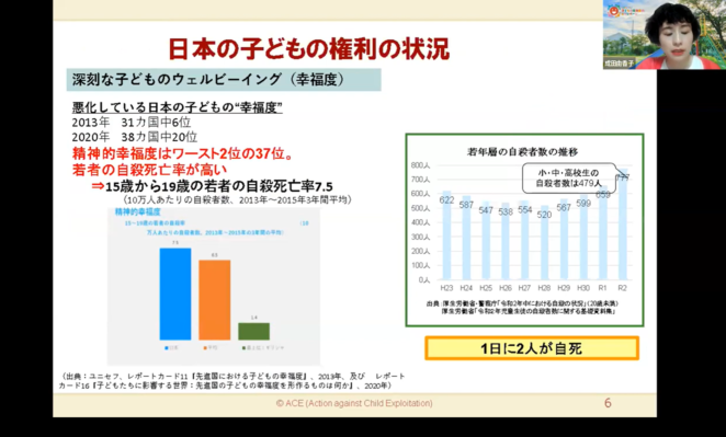 また、児童労働の多いガーナやインドだけではなく、日本でも子どもの権利が守られているとは言えません。日本の子どもの精神的な「幸福度」は先進国でワースト2位(38か国中37番目)、1日に2人の子どもが自死している、虐待の相談件数・いじめの認知件数が年々増えていることなど、子どもの権利に関して多くの課題が存在しています。「子どもの権利」を「聞いたことがない」という人も多く、啓発・普及が必要です。