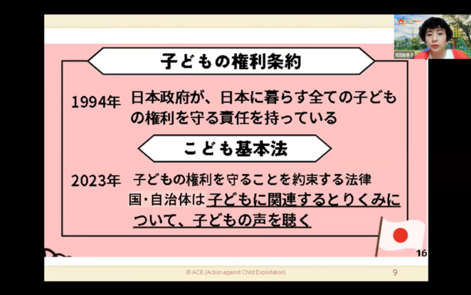 第二部では子どもの権利と児童労働について、ACEが事務局を務める「広げよう!子どもの権利条約キャンペーン」で事務局業務を担当している成田由香子よりご説明しました。