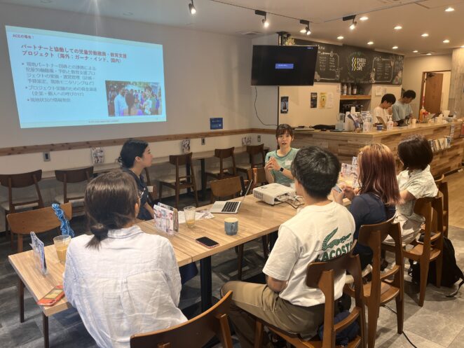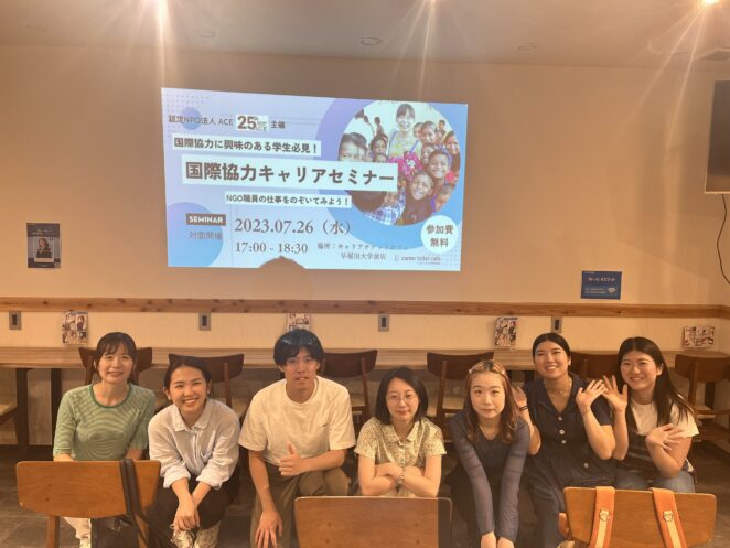 2023年7月26日(木)の夕方、キャリアチケットカフェ早稲田大学前店にて「国際協力キャリアセミナー」を開催しました。ACEスタッフの田柳優子(啓発・市民参加事業チーフ)が登壇し、国際協力に携わる仕事、ACEの事業・仕事内容をお伝えし、これまでのキャリアや仕事に対する想いなどを熱く語ってもらいました。