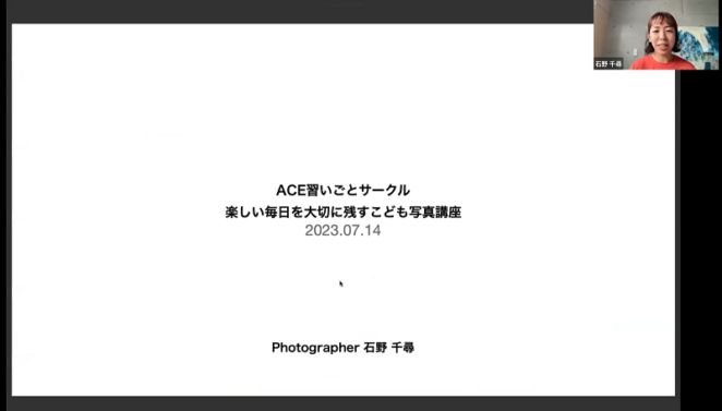 そんなACE習いごとサークルの第3回「楽しい毎日を大切に残すこども写真講座」にフォトグラファー石野千尋さんを講師としてお招きし、2023年7月14日(金)のお昼に開催しました。