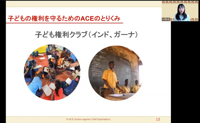 また、普段ACEの自己紹介をするときには、児童労働に関連した活動紹介を行っていますが、今回は子どもの権利という視点からインド・ガーナ・日本の活動をご紹介しました。