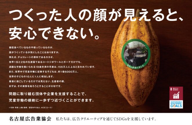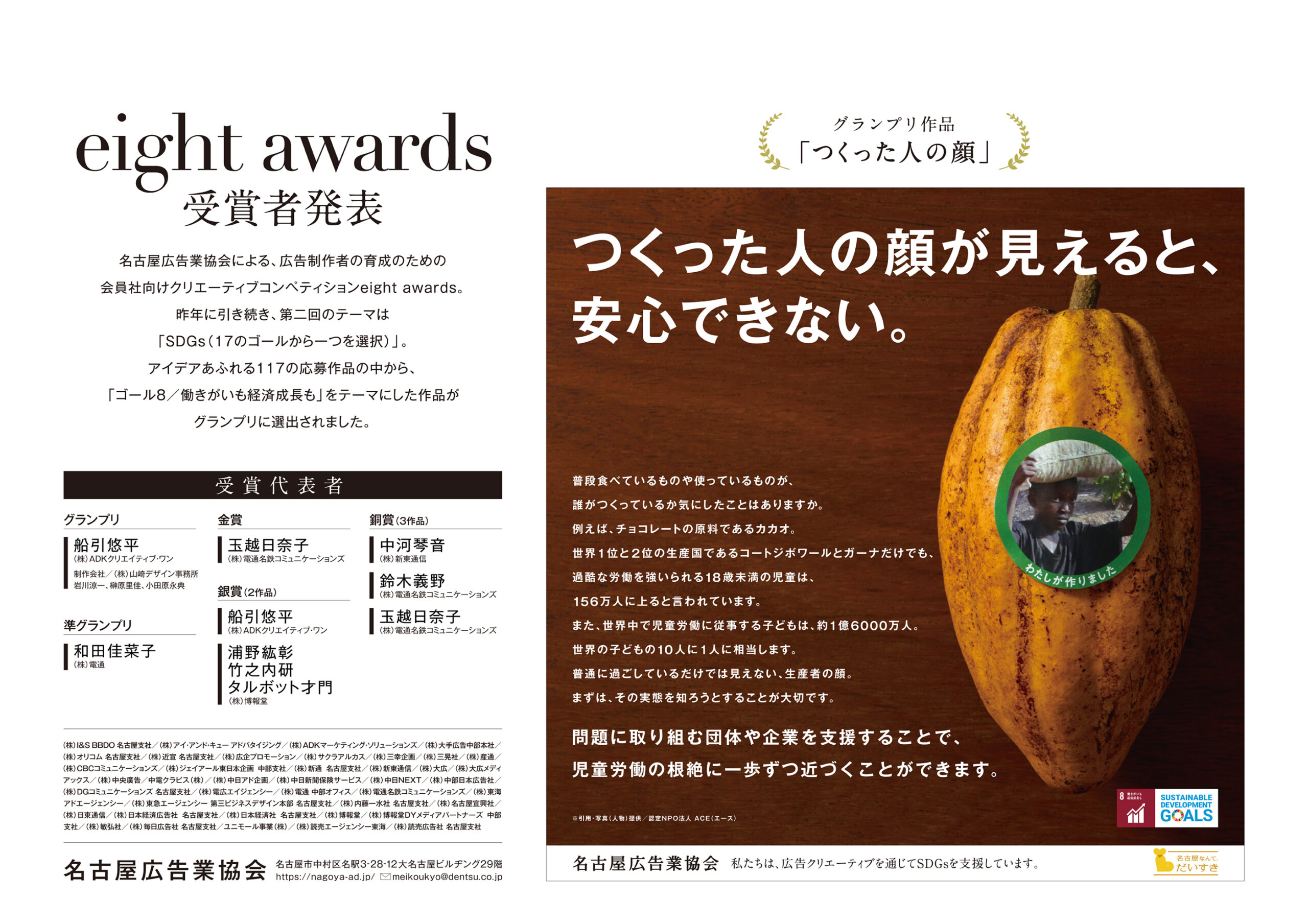「eight awards」は、名古屋広告業協会による、広告制作者の育成のための会員社向けクリエイティブコンペティションで、第二回の今回のテーマは昨年に引き続きSDGs。117の応募作品の中から「ゴール8/働きがいも経済成長も」(児童労働)をテーマにした本作品がグランプリに選ばれました。