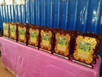最後に、これまでの活動への謝意と今度の活動への期待を表した記念の盾が住民ボランティアグループのメンバーへ贈られ、各メンバーは「今後は自立的に『児童労働のない村』を維持します」と宣言しました。