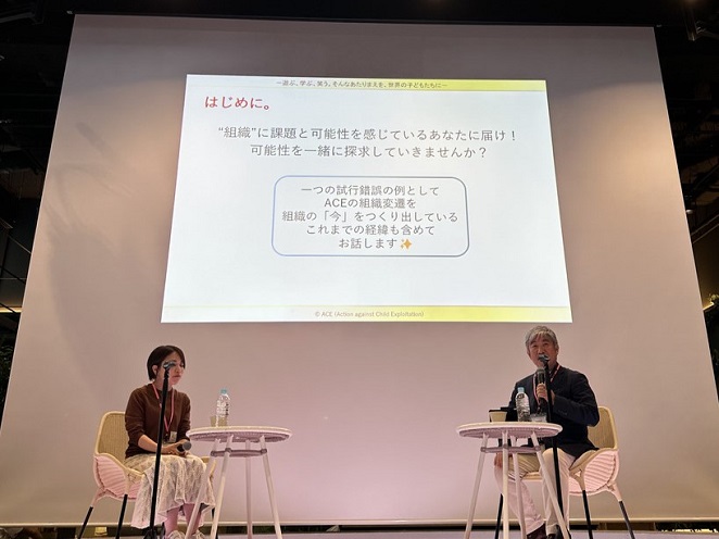 まずは、お二人の自己紹介とACEの組織開発の歴史についてのエピソードからスタートしました。現場の疲弊感をぬぐえないことへジレンマを抱き、人材育成の道へ進んだ石井さん。同じ目標を持っているのにみんな疲弊していき、自分が働けば働くほど辛くなるという自身の体験談を語りながら、ACEの組織変遷の歴史には様々な困難と苦労があったことを話す山下さん。この二人の様子からも、組織そのものの強化に本腰を入れなければいけないと考えた強い意志がくみ取れました。
