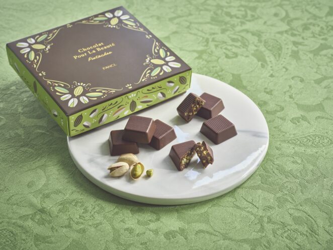 「ショコラ プー・ラ・ボーテ ピスターシュ」は、糖類不使用を実現しながら、カカオの深い香りで本格的な味わいが楽しめるチョコレート。1箱10個入りで1,400円、数量限定での発売です。