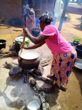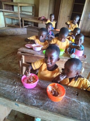 学用品の支援に続いて10月には、3つの小・中学校で学校給食の支援も開始しました。現在活動している2つの村では、特に水曜日から金曜日に子どもが学校を休んで保護者と一緒にカカオ農園や青空市場に行って仕事を手伝う傾向が強かったため、週5日のうち水~金曜日の給食をプロジェクトが支援し、月~火曜日は保護者がお金を出し合って 賄うことにしました。