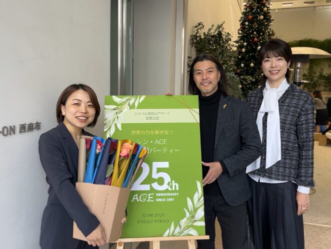 ACEは2023年3月、団体設立25周年という節目の年に、 SDGs達成のために優れた取り組みを行う団体等を表彰する「第6回ジャパンSDGsアワード」の「SDGs推進本部長(内閣総理大臣)賞」を受賞しました。この賞の受賞を記念して2023年12月8日にENEKO Tokyoにてパーティーを開催しました。そのパーティの様子をご報告します。