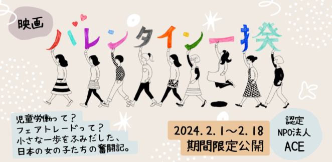 ガーナのカカオ産地で活動を続ける認定NPO法人ACEは、チョコレート生産地ガーナでの児童労働の現実に向き合い一歩踏み出した日本の女の子たちの奮闘記、映画「バレンタイン一揆」をチョコレートに注目の集まるバレンタインシーズンに合わせ、2024年2月18日までの期間限定でウェブサイトで限定公開します。また、2月中は全国9箇所で自主上映も予定されています。