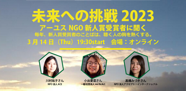 アーユス仏教国際協力ネットワークが主催するオンラインイベント「未来への挑戦2023」にACEスタッフの川村祐子が「アーユスNGO新人賞」(*)受賞者として登壇し、活動を通じての苦労や喜び、これからの展望などについてお話しします。
