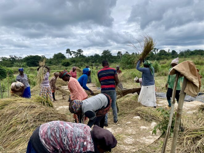 スマイル・ガーナ プロジェクトでは、稲作研修を通じて、女性たちがカカオ以外にも収入源を得られるようサポートしています。私が研修サイトを訪問した際には、15人の女性たちが賑やかに会話を交わしながら、稲の脱穀作業に取り組んでいました。