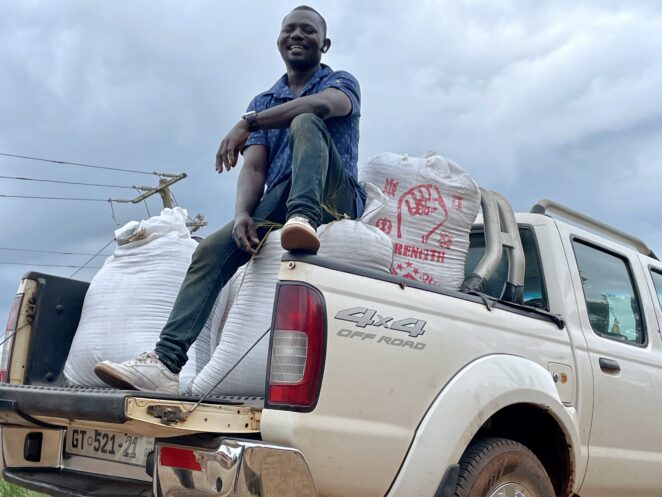 モミを袋詰めして小型トラックに積み込む作業が終わり、荷台がいっぱいになった様子を見たとき、女性たちの表情には大きな達成感と自信が満ちていました。クワメさんはその光景を感慨深く見つめていましたが、彼女たちに「頼んだよ!」と激励され、町の乾燥所に向けて出発する際には、責任感にあふれる頼もしい表情に戻っていました。