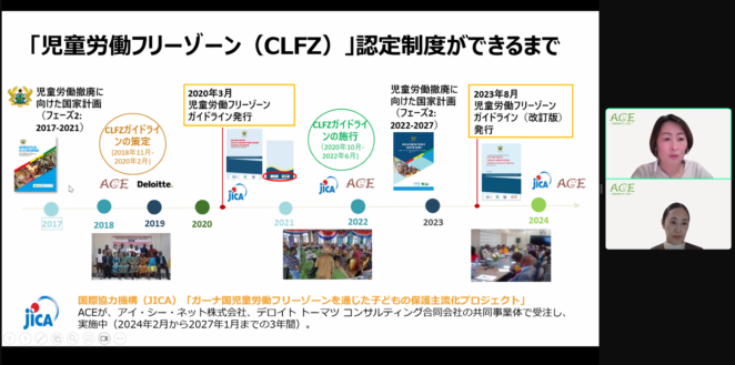 続いて、ACE副代表の白木と職員の松本より、ガーナ政府の実施する「児童労働フリーゾーン」構築にかかるプロジェクトについて報告しました。