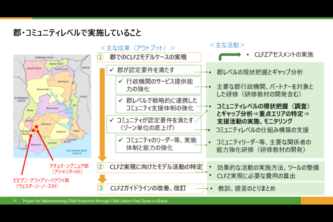見えてきた課題として、ガーナ政府が児童労働フリーゾーン制度の前提と考えている仕組みが、実際にコミュニティに入ってみると機能していないという実態が多々あることがわかってきました。