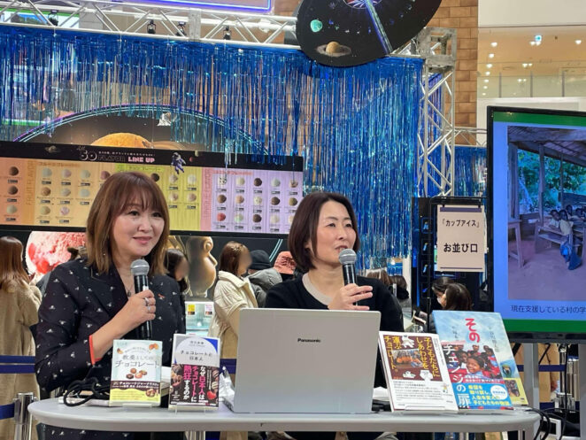 阪急うめだ本店9階の祝祭広場で開かれる本イベントは、世界的にも著名なショコラティエやチョコレートブランドの話を直接聞けるとても貴重なイベントとなっています。当日は「チョコレートとガーナの未来」と題して、日本が最も多くカカオを輸入するガーナのカカオ生産地の現状について、白木はガーナでカカオ農家の支援活動を長年続けてきた視点から、市川さんはチョコレート専門のジャーナリストとして現地を取材した視点から、それぞれお話ししました。