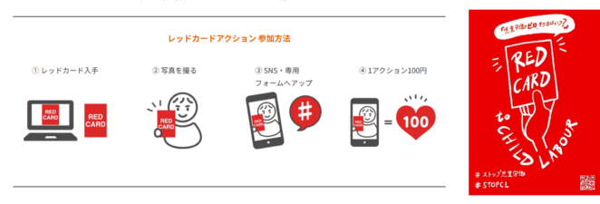 児童労働ネットワークでは、「ストップ!児童労働キャンペーン」を実施しています。その一環として、児童労働にNO!の意思を示す「レッドカードアクション」を展開中です。カードを持った写真をSNSに投稿すると、1枚につき100円が児童労働撤廃に取り組むNGO団体への寄付につながります。