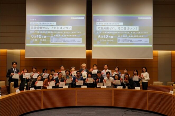 6月12日の児童労働反対世界デーにあわせ、児童労働ネットワークが第一衆議院議員会館で開催した院内集会「児童労働ゼロ、その日はいつ?」には、法務大臣、厚生労働副大臣、外務副大臣らが参加したほか、政府関係者・国会議員・JICA(国際協力機構)・企業・NGO・報道関係者・一般参加者77名が会し、児童労働撤廃に向けた議論や決意表明を行いました。