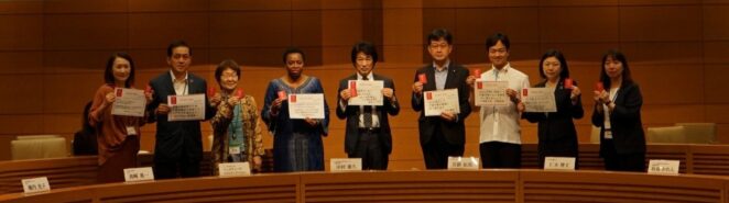 左から、大野容子JNNE副代表、髙﨑真一ILO駐日事務所代表、堀内光子児童労働ネットワーク代表、ジェネヴィーヴ・エドゥナ・アパルゥ駐日ガーナ大使、田村ILO活動推進議員連盟会長、仁木博文厚生労働副大臣、宮路拓馬外務副大臣、牧島かれんユニセフ議員連盟事務局長、岩附由香児童労働ネットワーク事務局長(ACE代表)