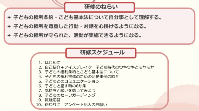 どちらの研修も共通して、「子どもの権利」と「こども基本法」の考え方を土台に、子どもの権利を尊重した行動・対話を実践したり、子どもの安心・安全を守るために、おとなができることを学び・語り合う場となりました。
