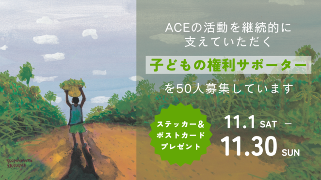 毎月の寄付で継続的にACEの活動を支える「子どもの権利サポーター」を50人募集しています。児童労働のない、子どもが大切にされる世界をめざしてともに歩む仲間になってください。